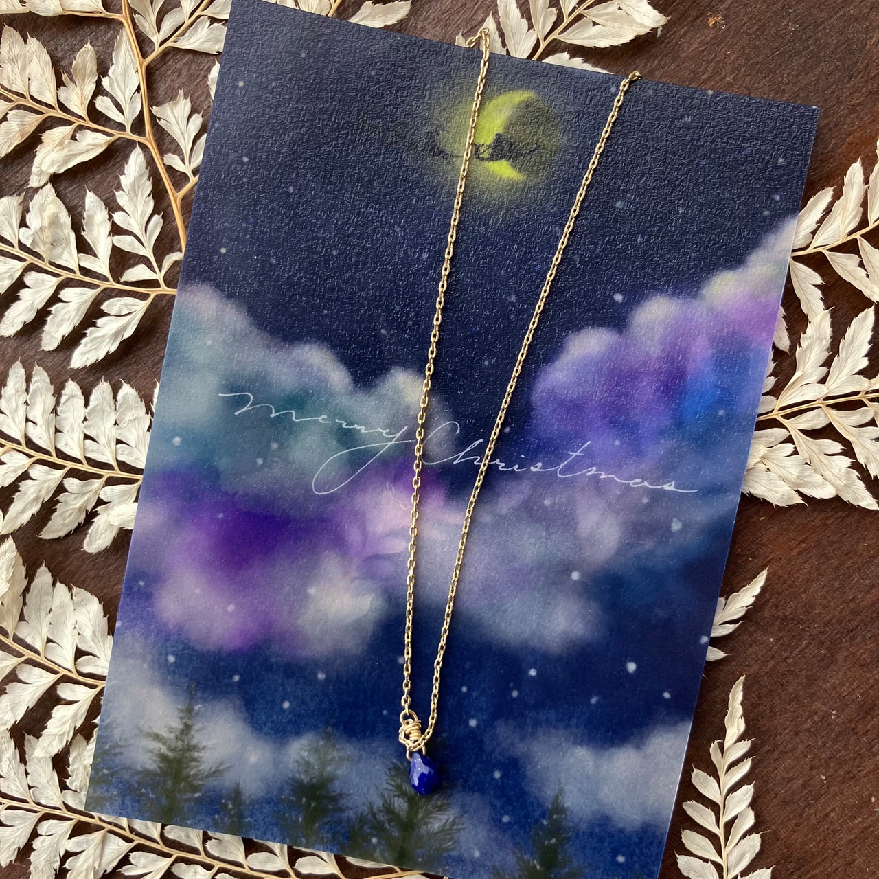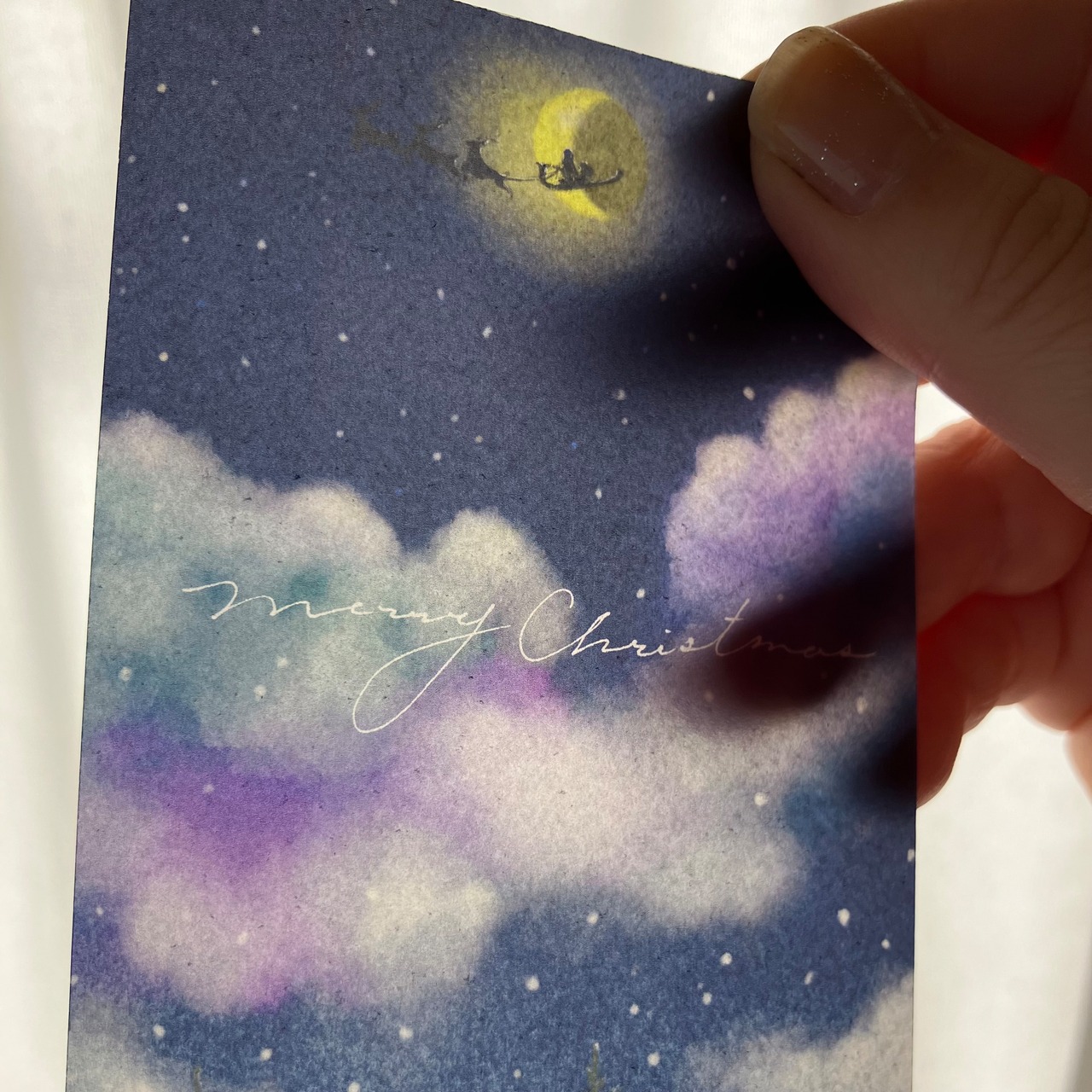 サンタクロースが月の光を浴びながら、夜空を駆け抜ける様子を描いたカードです。