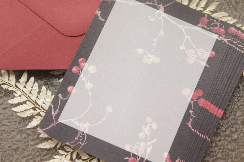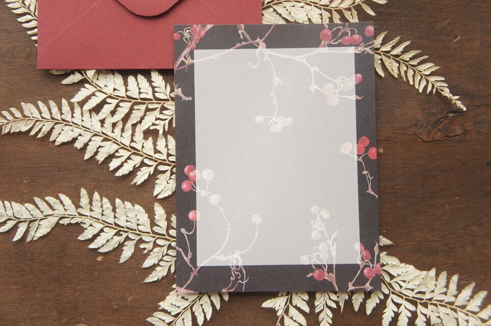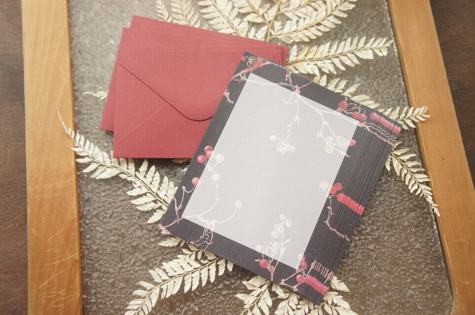 便箋を10枚、便箋を半分に折りたたむとちょうど良いサイズで収まるシックなボルドーのミニ封筒を5枚入れています。