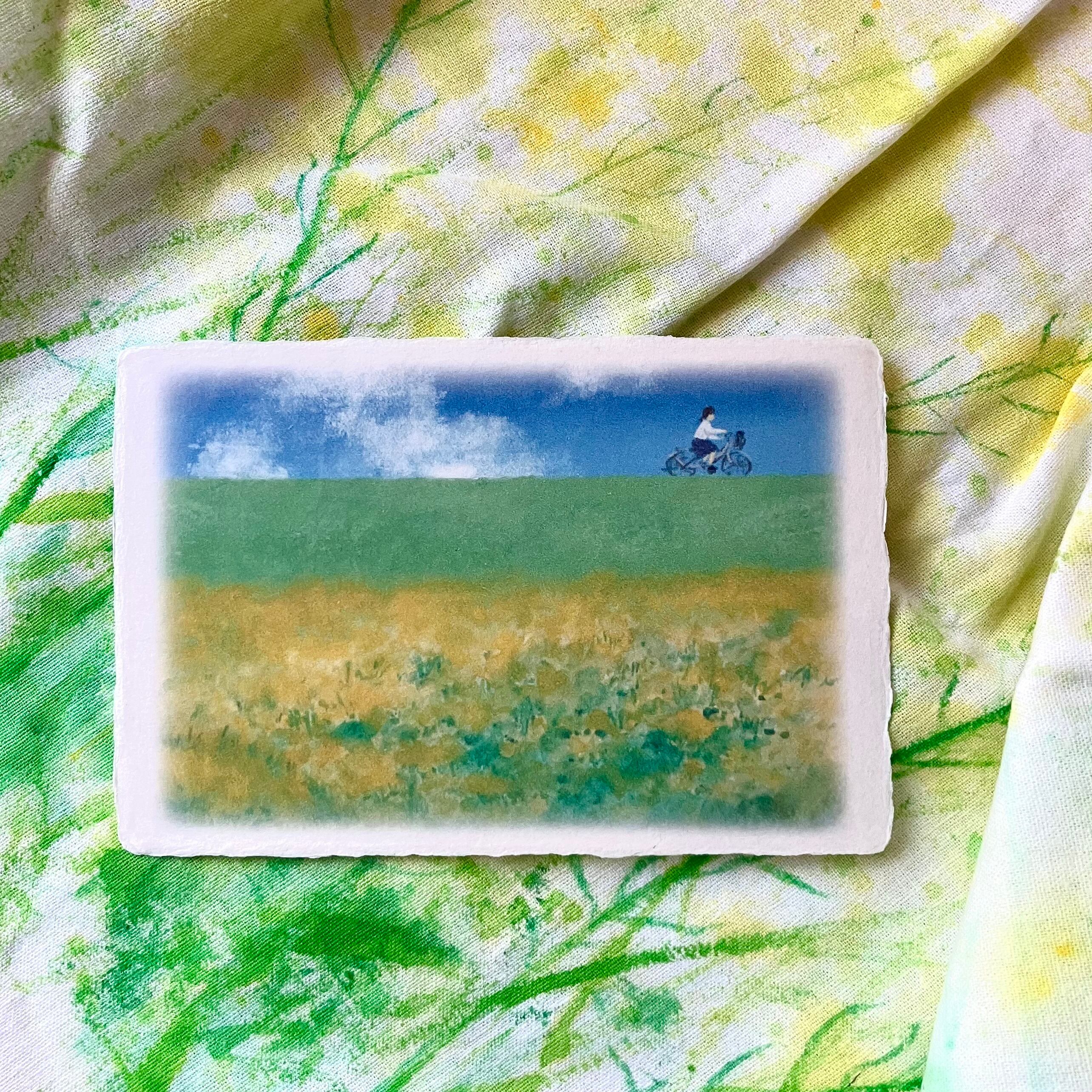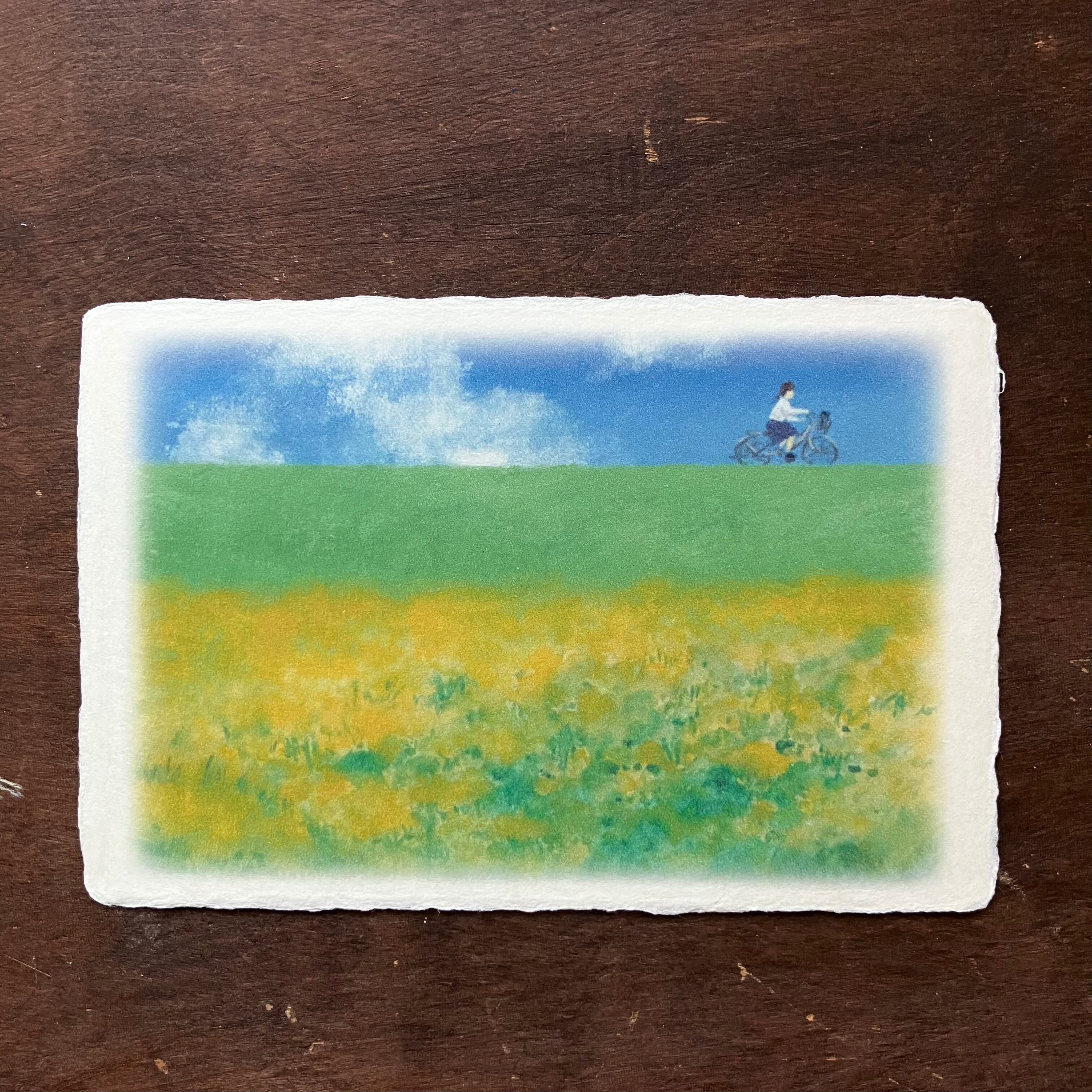 菜の花が咲く通学路を自転車で颯爽と通ってゆく様子を描きました。