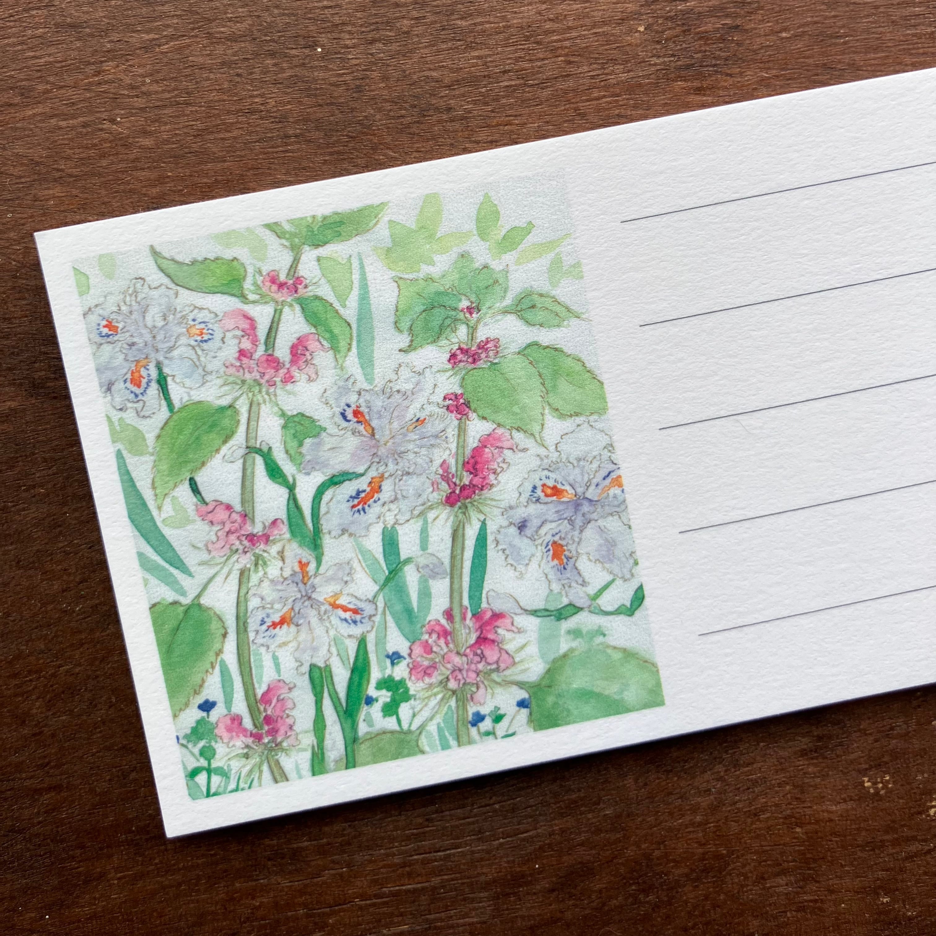 シャガ、踊り子草、オオイヌノフグリなどの春の草花を描いたカードです。